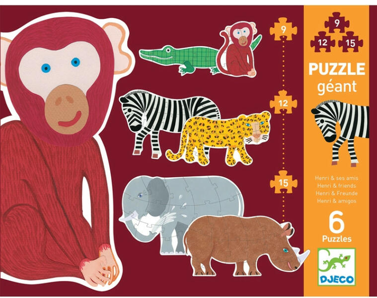 7 vadállat kirakása 3 nehézségi szinten. Óriás puzzle a Djeco grafikus művészének tervezésében. Az állatfigura sziluettjét is megformázó puzzlerészekből álló óriás puzzle A három rész külünböző nehézségi fokozatnak felel meg az összerakás, kirakás szempontjából. Különböző vadállatok képei kerülnek egymás fölé. Csodás képet adnak ki együtt, egyik álla