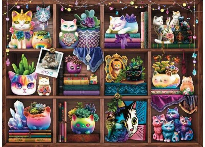 A Ravensburger a világ legnagyobb puzzle gyártója. Széles választékban kapható kirakói a minőséget és a sokszínűséget képviselik. A Ravensburger 500 db-os - Cicák és pozsgások puzzle e két téma kedvelőinek készült. A kirakott képen egy vidám hangulatú, pozsgásokkal és cicákkal teli polcot láthatunk.