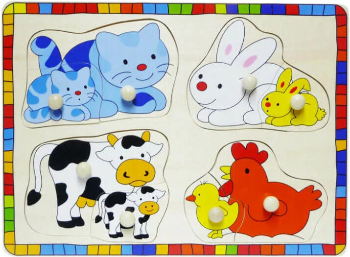 RAKTÁRRÓL AZONNAL! Fogantyús puzzle - Cicás Fogantyúval ellátott állatos fa puzzle. Első kirakónak a legtökéletesebb választás . A kirakó méreteinek és a fogantyúnak köszönhetően könnyen kézbe tudják venni a legkisebbek is . A játék során megismerkednek a színekkel, formákkal és a különböző állatok elnevezéseivel. Mindezek mellett fejlődik a finommotorikus és f