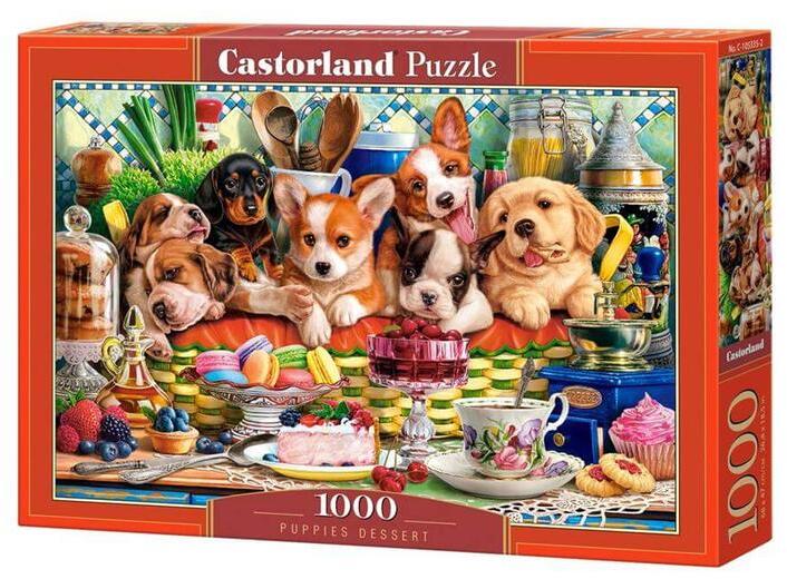 A Castorland kirakók sokszínűségükről ismertek és igen széles választékban kaphatóak. Hagyományos képi témáik mellett különlegesebb, városokat és nevezetességeket ábrázoló kirakókat is találunk kínálatukban. A Castorland 1000 db-os puzzle - Délutáni tea kiskutyákkal (C-105335) című képen édibédi kiskutyákat látunk, akik nem igazán tudnak ellenállni a sok fino
