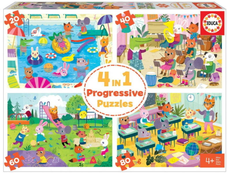 Az Educa gyerekeknek készült kirakói kiváló minőséget képviselnek széles választékban. A puzzle kirakása számos képességet fejleszt, türelemre tanít, finomítja a kézmozdulatokat, fejleszti a precizitást, a koncentrációt és a megfigyelőképességet. A 4 az 1-ben puzzle különböző darabszámú kirakókat tartalmaz, így a gyerekek fokozatosan fejlődhetnek a kisebb darabsz