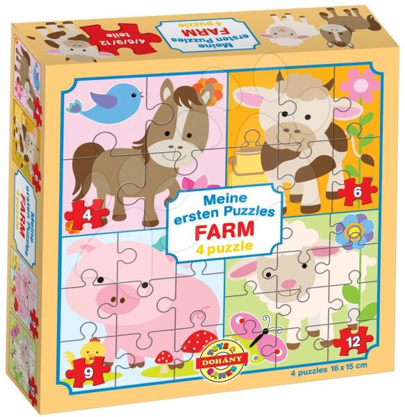 Dohány Az én első puzzlem egy gyönyörű puzzle legkisebbeknek farmon élő állatok motívummal. A csomagolásban találnak 4 különböző kirakót , pontosabban 4 darabosat, 6 darabosat, 9 darabosat és 12 darabos puzzlet. Mivel a darabok száma és kirakásának nehézsége változó, így együtt növekszik gyerkőcével. Gyerekek köszönhetően a tarka képek segítségével megismerik