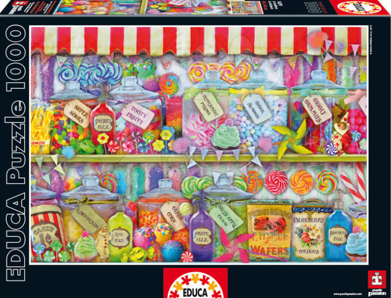Puzzle gyermekek és felnőttek részére Cukorkabolt motívummal. A puzzle motívumát egy cukorkabolt látványa ihlette. A csomagolás 1000 db puzzle elemet tartalmaz. A puzzle darabjainak megfelelő helyre illesztése egységes képet alkot. A puzzle kiemelt minőségű anyagból készült és megfelel a biztonsági szabványoknak, így nem jelent veszélyt sem gyermekekre, sem felnőttekre. A
