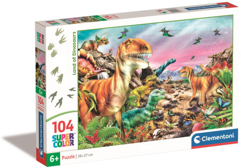 Dinoszauruszok földje 104db-os Supercolor puzzle - Clementoni Hivatalos magyarországi forgalmazótól. Leírás: A "Dinoszauruszok földje" 104 darabos Supercolor puzzle egy izgalmas időutazás a gyerekek számára, ahol felfedezhetik a régi idők óriásait, a dinoszauruszokat. A színes, részletgazdag illusztrációk megelevenítik a leglátványosabb őshüllőket, mint például a rettege