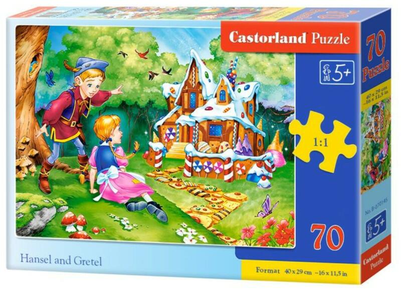 A Castorland kirakók sokszínűségükről ismertek és igen széles választékban kaphatóak. Hagyományos képi témáik mellett különlegesebb, városokat és nevezetességeket ábrázoló kirakókat is találunk kínálatukban. A Castorland 70 db-os puzzle - Jancsi és Juliska című képén a Grimm testvérek híres meséjének két főszereplője és a mézeskalács házikó látható.