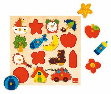 Ezek a fából készült fogantyús puzzle-k a legkisebbek kézügyességét, formafelismerését fejlesztik. Játék közben ismereteket gyűjtenek környezetükről. Keresd meg a táblán a helyét a 15 db vidám színekkel készült, különböző fogantyús figuráknak a formáik alapján.