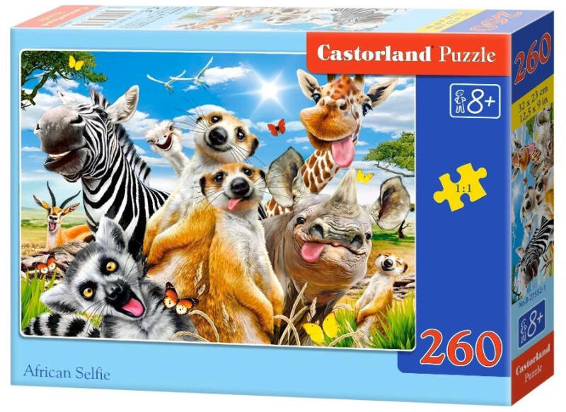 A kép 260 darabos, és kiváló minőségű anyagokból készült. A kész képet akár a szobád falára is kiakaszthatod, és minden nap egy tündérmesébe illő kép tárul eléd. Tulajdonságok: - Kiváló minőség - 260db-os puzzle - A doboz mérete: 24,5x17,5x3,7cm - A kirakott kép mérete: 32x23cm Afrikai szelfi Termékcsalád: 260 Minőségi termék. Származási ország: Lengyelorszá
