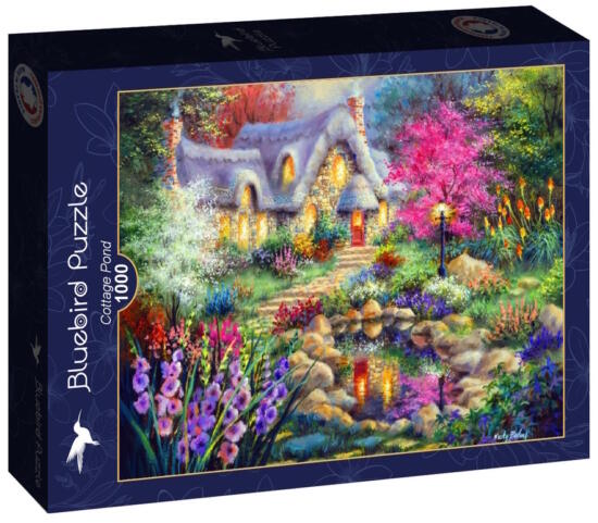 A francia Bluebird vállalat 2019-ben lépett piacra kiváló minőségű kirakóival, megfizethető áron. Fontos szempont számukra a környezettudatosság is, ezért kirakóik dobozait úgy tervezték, hogy minimális mennyiségű kartont használjanak fel a gyártás során. A Bluebird 1000 db-os puzzle - Cottage Pond című képén egy idilli tóparti házikó látható, Nicky Boehme amerikai