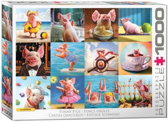 Az EuroGraphics kirakók sokszínűségükről ismertek és igen széles választékban kaphatóak. Hagyományos képi témáik mellett különlegesebb, városokat és nevezetességeket ábrázoló kirakókat is találunk kínálatukban. Az EuroGraphics 1000 db-os puzzle - Funny Pigs, Lucia Heffernan (6000-5770) Lucia Heffernan művész szeszélyes és gyakran humoros disznóművészeti képeinek