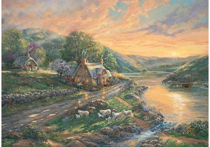 A Schmidt puzzle kiváló minőségű, német gyártmányú kirakó. A speciális matt lakk felhasználás következtében a kirakók fényvisszaverődés nélkül tárják elénk a szebbnél szebb képeket. A Schmidt 1000 db-os puzzle - Dawn in Emerald Valley kirakón Thomas Kinkade Hajnal a Smaragd-völgyben című festménye látható. A kép hangulata magával ragadó, békét sugároz: a nap