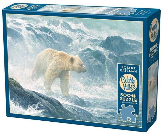 A kanadai Cobble Hil l a nosztalgikus, színes, és mindemellett kiváló minőségű kirakókkal kívánja örvendetessé tenni a játék élményt kicsiknek és nagyoknak egyaránt. Ezen a Cobble Hill 500 db-os puzzle - Salmon Watch - Spirit Bear (45026 ) kirakón egy Robert Bateman által megalkotott kép látható. Egy fehér jegesmedve sétál a víz sziklás felszínén, mögötte pedig egy