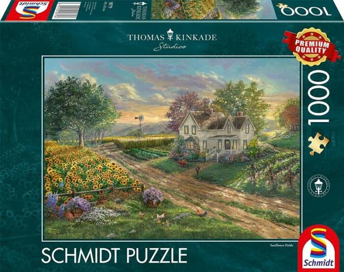 A Schmidt puzzle kiváló minőségű, német gyártmányú kirakó. A speciális matt lakk felhasználás következtében a kirakók fényvisszaverődés nélkül tárják elénk a szebbnél szebb képeket. Schmidt 1000 db-os puzzle - Sunflower fields, Thomas Kinkade képen egy csodálatos vidéki csendélet látható, napraforgó kkal.
