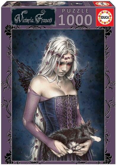 Az Educa garantálja a prémium minőséget és minden 500, 1000, 1500 és 2000 darabos puzzle terméke mellé Puzzle-fix ragasztó t ad ajándékba, mellyel az elkészült kép rögzíthető. Az Educa 1000 db-os puzzle - A halál angyala - Victoria Francés képén a romantikus és misztikus festményeket alkotó spanyol művész ábrázolásában egy síró, sötét ruhás angyal és fekete macs