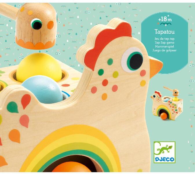 A koccantó fejlesztő játék nagy siker a kisgyermekek körében. Egészen kicsi koccantástól hullik alá a színes tojás a tyúkanyó hasába és gurul ki az újabb játékhoz. A színek egyeztetésének szükségességével mintha arra tanítaná a gyermekeket, hogy "többet ésszel, mint erővel!". A Djeco fejlesztő játékai között ez a játék is egy jól átgondolt tervezés eredmén