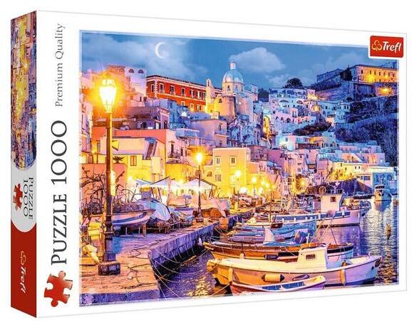 A Trefl kirakók kiváló minőségű, speciális fényvisszaverő papír felhasználásával, ökológiai anyagból készülnek, amely megkönnyíti az összeillesztést. A Trefl 1000 db-os puzzle - Premium Quality puzzle - Procida sziget éjjel, Olaszország című képén a mesés olaszországi este látható.