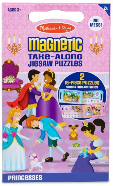 Ez a hordozható játékkészlet két 15 darabból álló mágneses puzzle-t tartalmaz elbűvölő hercegnős jelenetekkel, kompakt, kihajtható formátumban és beépített hordozófogantyúval! A darabok a hátulján alakkóddal vannak ellátva a könnyű válogatás érdekében, és a belső felületekhez tapadnak, hogy minimálisra csökkentsék a rendetlenséget, így ez egy nagyszerű utazó