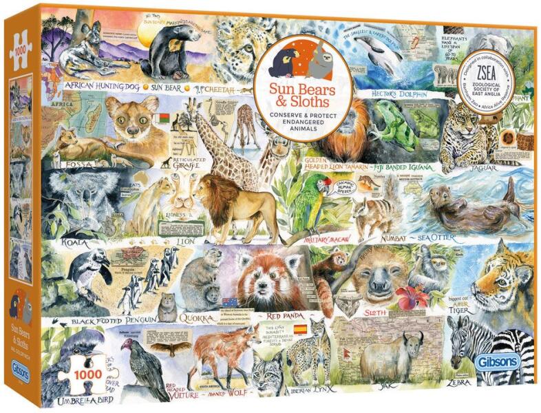 1000 darabos kirakó . Márka: Gibsons Művész: Val Goldfinch Kirakott kép méret: 68 x 49 cm Doboz méret: 34 x 24,5 x 6 cm Eredeti cím: Sun Bears & Sloths GTIN: 5012269071344