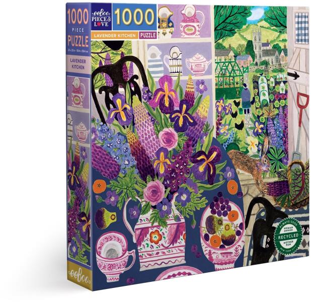1000 darabos kirakó Új, 2023-as megjelenés!Gyárilag fólia nélkül készült Márka: Eeboo Művész: Vanessa Bowman Kirakott kép méret: 58,4 x 58,4 cm Doboz méret: 28 x 28 x 5 cm Eredeti cím: Lavender Kitchen GTIN: 689196514623