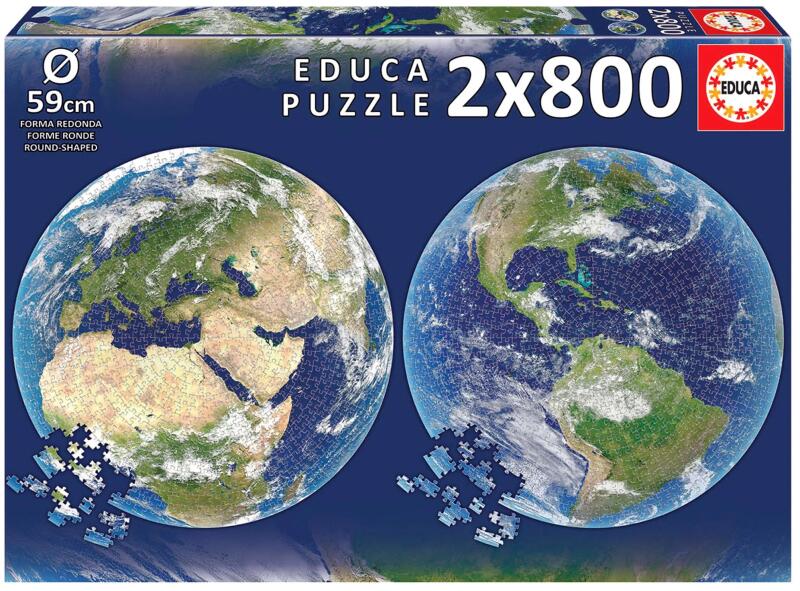 Puzzle gyermekek vagy felnőttek részére Planet Earth Round motívummal a spanyol Educa vállalat műhelyéből örömet szerez a képkirakók szerelmeseinek 2 kerek ábrával a Föld bolygóról , miközben az ábrák 2x800 darabosak. A puzzle gyermekek vagy felnőttek részére darabjainak megfelelő helyre illesztése egységes képet alkot. A puzzle kiemelt minőségű anyagból készült é