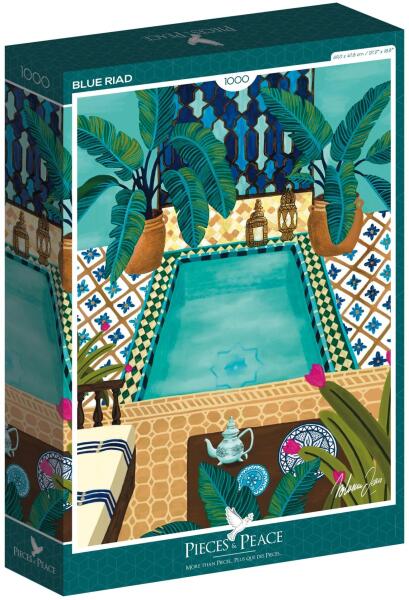 1000 darabos kirakó . Márka: Pieces & Peace Művész: Nolwenn Studio Kirakott kép méret: 47.8 x 69 cm Doboz méret: 35,5 x 24 x 5,5 cm Eredeti cím: Blaues Riad GTIN: 3770001400082