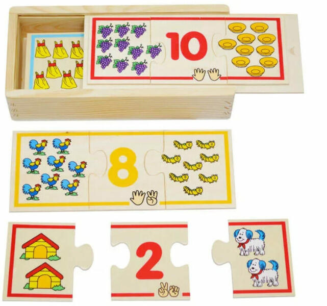 Fából készült számpárosító puzzle. Óvodáskorú gyermekek számára remek fejlesztő játék. A feladat lényege: megtalálni és összeilleszteni a megfelelő darabokat. A játék ismerteti és gyakoroltatja a számokat, színeket és formákat játékos módon. Mérete...