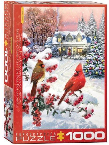 Az új technológiának köszönhetően a puzzle Smart cut vágással készült, ami izgalmasabb kirakást nyújt. Az EuroGraphics 1000 db-os puzzle - Cardinal Pair kirakó képén egy vörös kardinálispinty pár látható gyönyörű havas tájjal, egy házikóval és fenyőfákkal a háttérben.