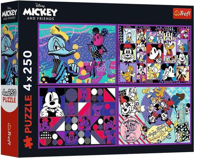 A Trefl kirakók kiváló minőségű, speciális fényvisszaverő papír felhasználásával, ökológiai anyagból készülnek, amely megkönnyíti az összeillesztést. A Trefl 4 x 250 db-os puzzle - Disney - Mickey Mouse kalandjai kirakott képein Mickey egér és barátai láthatóak.