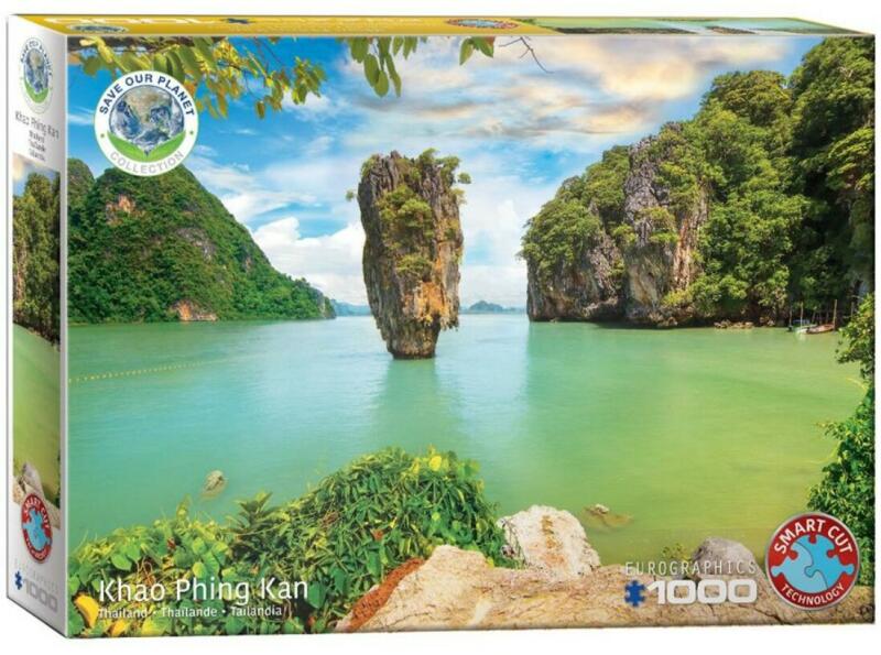 Az Eurographics 1000 db-os puzzle - Save our planet - Khao Phing Kan, Thailand című kép segítségével az Andamán-tenger, Phang Nga-öblébe csöppenünk, ahol a parttól 20 méterre egy csodálatos természeti jelenség, a Ko Tapu nevű szigetecske emelkedik ki a tengerből. Az Eurographics gyártó nagy figyelmet fordít a környezettudatos működésre, úgy a termékeik előállításán