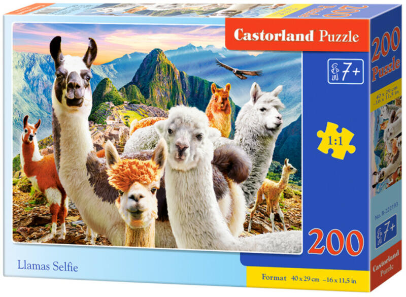 A Castorland kirakók sokszínűségükről ismertek és igen széles választékban kaphatóak. Hagyományos képi témáik mellett különlegesebb, városokat és nevezetességeket ábrázoló kirakókat is találunk kínálatukban. A Castorland 200 db-os puzzle - Láma szelfi képén különböző fajtájú, aranyos lámák láthatók Machu Picchu festői szépségű romvárosa előtt.