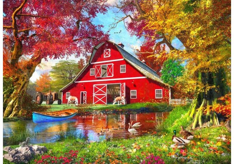 A francia Bluebird 2019 óta van jelen a kirakók világpiacán. Magas minőségű, környezettudatos technológiával készült, mégis megfizethető áron elérhető puzzle képei közt elsősorban művészi alkotások találhatók. Az 1500 db-os Bluebird puzzle - Sunny Autumn At The Barn című őszi hangulatú képén egy amerikai farm elevenedik meg, tehenekkel, traktorral, egy tóval, csóna