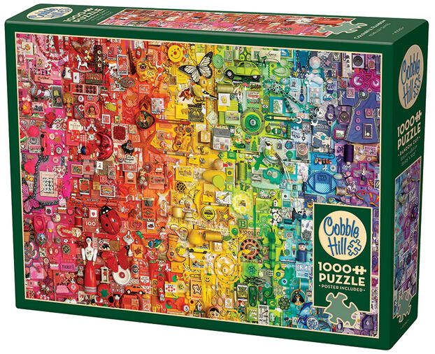 A kanadai Cobble Hill a nosztalgikus, színes, és mindemellett kiváló minőségű kirakókkal kívánja örvendetessé tenni a játék élményt kicsiknek és nagyoknak egyaránt. A Cobble Hill 1000 db-os puzzle - Colourful Rainbow című képen színes szívárványok láthatóak.