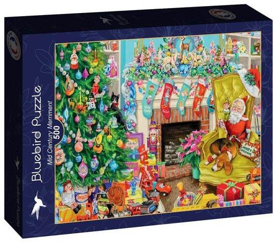 A francia Bluebird 2019 óta van jelen a kirakók világpiacán. Magas minőségű, környezettudatos technológiával készült, mégis megfizethető áron elérhető puzzle képei közt elsősorban művészi alkotások találhatók. Az 500 db-os Bluebird puzzle - Mid Century Merriment című képén egy századközepi stílusú karácsonyi idillt láthatunk, karácsonyfával, rengeteg játékkal