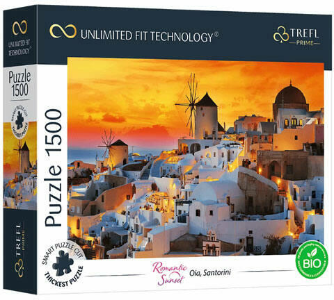 A Trefl 26195 Prime puzzle - Romantikus naplemente Oia, Santorini kirakósa segítségével egy lélegzet elállító tengerparti naplementét csodálhatunk meg, a csodálatos Santorini látképével. Alkotás közben, míg az 1500 darab puzzle elem a helyére kerül, kellemesen szórakozhatunk és átérezhetjük ennek az impozáns tengerparti városnak a kellemes, romantikus hangulatot árasztó