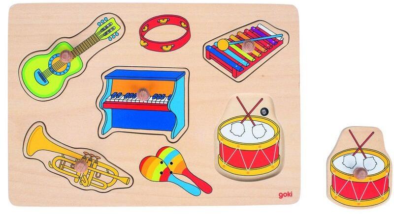 Fogantyús fa kirakó játék 5 kirakó elemmel. A kirakó darabokat a helyükre téve az adott hangszer hangja szólal meg. Anyaga: fa Méret: 30 x 21 cm