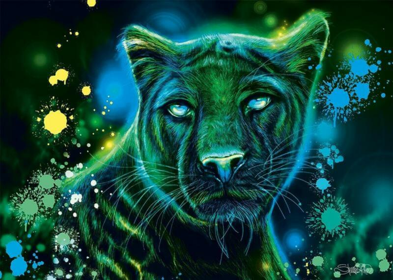 A Schmidt puzzle kiváló minőségű, német gyártmányú kirakó. A speciális matt lakk felhasználás következtében a kirakók fényvisszaverődés nélkül tárják elénk a szebbnél szebb képeket. A Schmidt 1000 db-os puzzle - Neon Blue Green Panther, Sheena Pike című képen, egy neon festékkel festett méltóságteljes párduc látható, fekete háttérrel és neon festékfoltokkal.