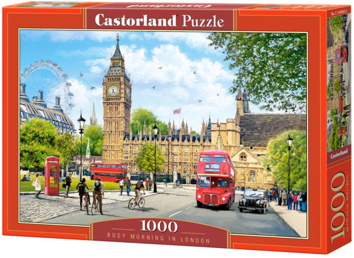A Castorland kirakók sokszínűségükről ismertek és igen széles választékban kaphatóak. Hagyományos képi témáik mellett különlegesebb, városokat és nevezetességeket ábrázoló kirakókat is találunk kínálatukban. A Castorland 1000 db-os puzzle - Busy Morning in London című képen London belvárosát láthatjuk, és egy emeletes buszt.
