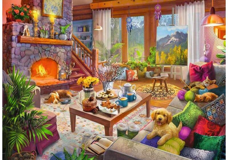 A Ravensburger a világ legnagyobb puzzle gyártója. Széles választékban kapható kirakói a minőséget és a sokszínűséget képviselik. A Ravensburger 1000 db-os - Hangulatos házikó puzzle képén egy hangulatos hétvégi ház nappalijából kémlelhetjük a távoli hegyeket. A kandallóban tűz lobog, az asztalon sütemény és tea, játékos cicák és egy kis kutya várják a gazdika