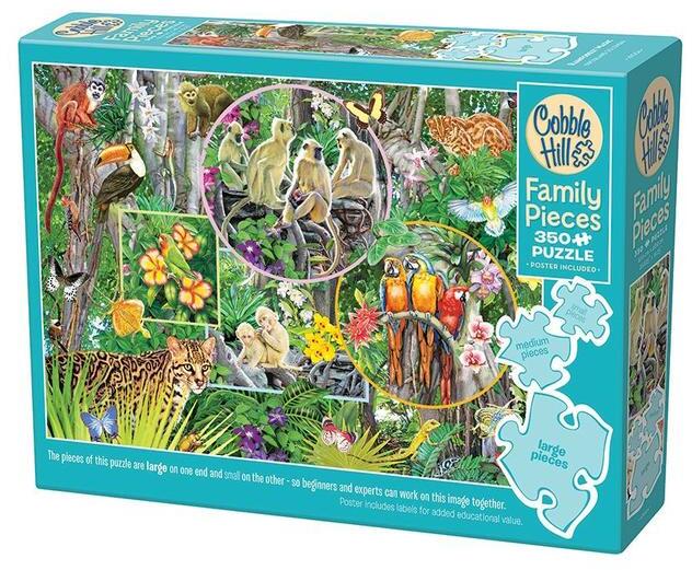 Co bble Hill Family puzzle , egy kirakó az egész családnak! A puzzle egyaránt tartalmaz nagy, közepes és kicsi darabokat, így igazán egyedülálló élményt nyújt mindenkinek. Ideális kicsiknek és nagyoknak, illetve azoknak, akik ritkán kirakóznak. Cobble Hill 350 db-os Family puzzle - Rainforest Magic (47004) képén az esőerdő színes állatvilágát láthatjuk, majmokat, madarak