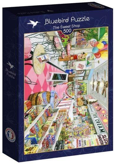 A francia Bluebird 2019 óta van jelen a kirakók világpiacán. Magas minőségű, környezettudatos technológiával készült, mégis megfizethető áron elérhető puzzle képei közt elsősorban művészi alkotások találhatók. Az 500 db-os Bluebird puzzle - The Sweet Shop című képén egy vidám, színs édességbolt látható, sok-sok nyalánksággal, csokival, cukorkával és nyalóká