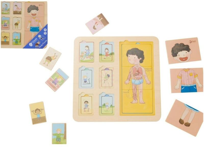 Az emberi test puzzle három rétegből áll. Megmutatja a test felépítését izmokból, szervekből és csontokból. A gyerekeknek lehetőségük van az emberi test felfedezésére. A puzzle 19 fa alkatrészt tartalmaz (a szőnyeggel együtt). A szőnyeg mérete: 30 x 30 cm 12 hónapos kortól használható gyermekek számára
