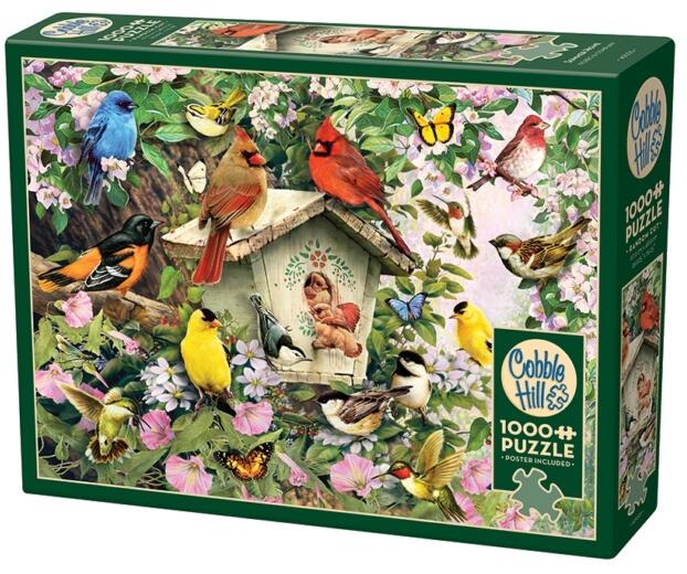 A kanadai Cobble Hill a nosztalgikus, színes, és mindemellett kiváló minőségű kirakókkal kívánja örvendetessé tenni a játék élményt kicsiknek és nagyoknak egyaránt. A Cobble Hill 1000 db-os puzzle - Summer Home című képen színes madarak láthatóak a madáretetőn pihenve.