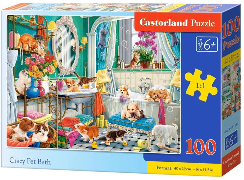 A puzzle összesen 100 darabkából áll össze, amik kiváló minőségű anyagokból készültek, így sokáig ékeskedhetnek bekeretezve a faladon. Tulajdonságok: - 100db-os puzzle - kiváló minőség - A kirakott kép mérete: 40 x 29 cm Őrült Pet Bath Termékcsalád: 100 Minőségi termék. Származási ország: Lengyelország A kirakott puzzle mérete 40 x 29 cm