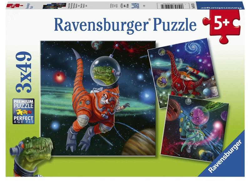 A Galaktikus dinoszauruszok készlet 3 különböző kirakó játékot tartalmaz, melyek mindegyike 49 darabból rakható össze. A képeken űrhajós ruhás dinoszauruszokot láthatnak a gyerkőcök, akik épp felfedezik az univerzumot.