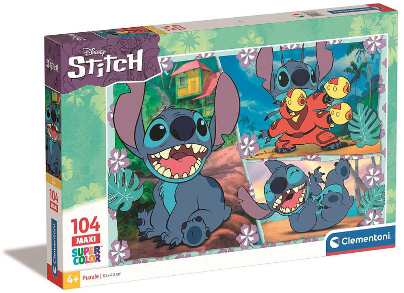 Disney Lilo és Stitch, A csillagkutya maxi puzzle 104 db-os Clementoni Mérete:62x42 cm Doboz mérete: - SuperColor kollekció - kiváló minőség - 4 éves kortól ajánlott