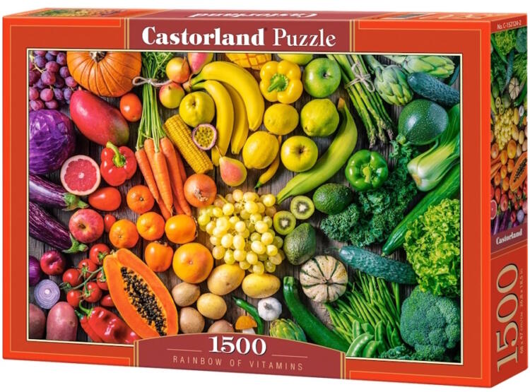 A Castorland kirakók sokszínűségükről ismertek és igen széles választékban kaphatóak. Hagyományos képi témáik mellett különlegesebb, városokat és nevezetességeket ábrázoló kirakókat is találunk kínálatukban. A Castorland 1500 db-os puzzle - Vitamin szivárvány című képen egy igazi vitamin bomba robban elénk zöldségek és gyümölcsök formájában a szivárvány s