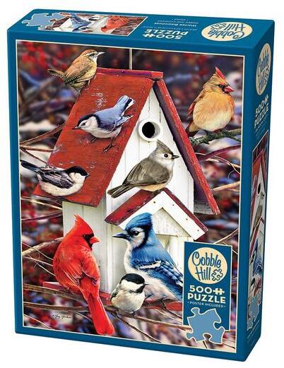 A kanadai Cobble Hil l a nosztalgikus, színes, és mindemellett kiváló minőségű kirakókkal kívánja örvendetessé tenni a játék élményt kicsiknek és nagyoknak egyaránt. Ezen a Cobble Hill 500 db-os puzzle - Winter Birdhouse (45065) kirakón egy piros-fehér madárház látható. Néhány tollas barát gyűlt össze egy baráti látogatásra ezen a szép délutánon.