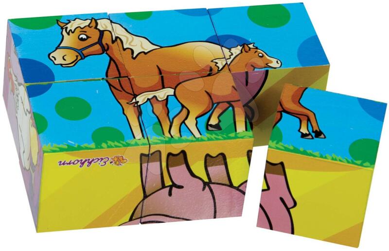 Fa kocka puzzle Picture Cube Small a német Eichhorn vállalat műhelyéből kiváló első kirakós ajándék minden gyerkőc részére már 24 hónapos kortól. Készségfejlesztő 6-részes kocka készlet 6 különböző motivumot rejt, igy az összeillesztett ábrákon tyúkocskák, bocik, kecskék, lovacskák, barikák és malackák jelennek meg. Kirakózás közben fejlődik a finom motorika