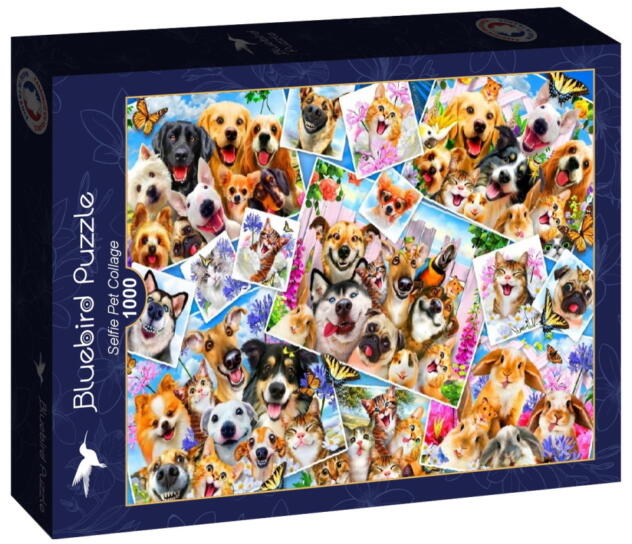 A francia Bluebird 2019 óta van jelen a kirakók világpiacán. Magas minőségű, környezettudatos technológiával készült, mégis megfizethető áron elérhető puzzle képei közt elsősorban művészi alkotások találhatók. Az 1000 db-os Bluebird puzzle - Selfie Pet Collage című képén vidáman mosolygó, mókás kutyusok, cicusok és nyuszik kollázsa látható.