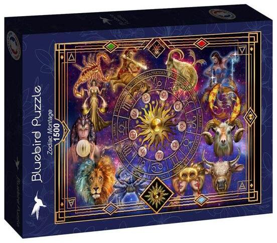 A francia Bluebird 2019 óta van jelen a kirakók világpiacán. Magas minőségű, környezettudatos technológiával készült, mégis megfizethető áron elérhető puzzle képei közt elsősorban művészi alkotások találhatók. Az 1500 db-os Bluebird puzzle - Zodiac Montage az asztrológia kedvelőinek készült. A kirakott képen az állatövi jegyek elevenednek meg.
