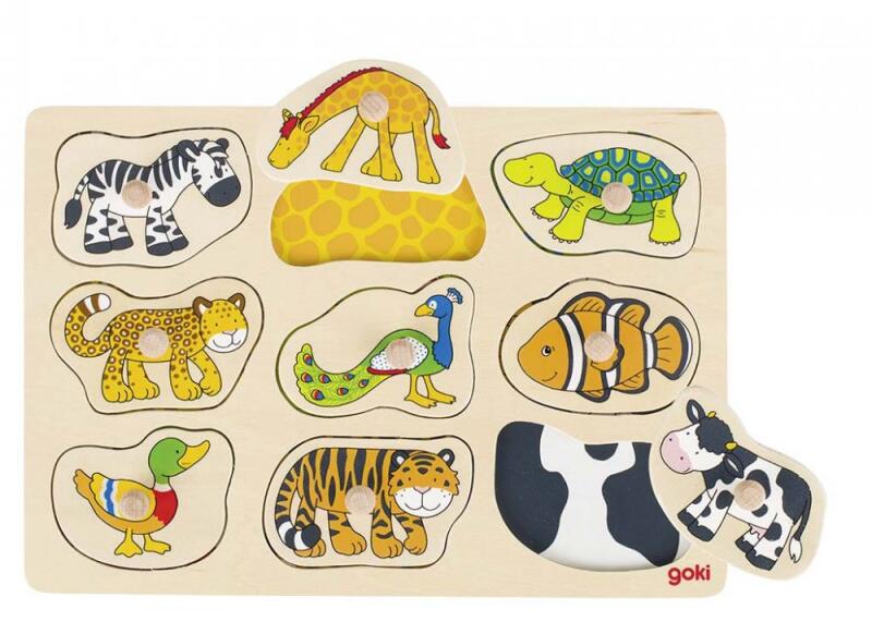 Fogantyús fa kirakó játék kicsiknek háttérképpel, 9 db-os. Milyen a boci bundája? És a zsiráfét ismered-e? Háttérképes, fogyantyús fa kirakó játék kedvelt állatfigurákkal. Anyaga: fa Méret: 30 x 21 cm